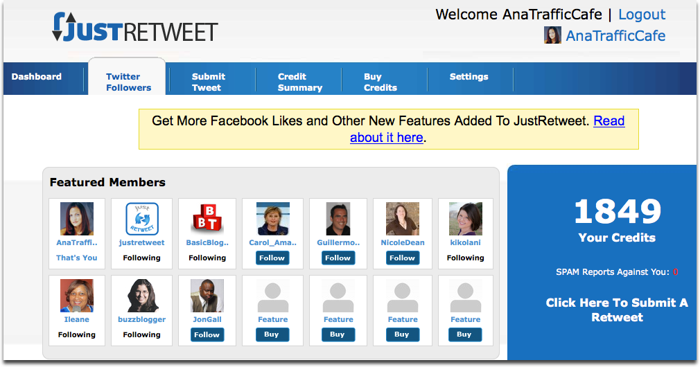 - When you have earned enough credits, then you can submit your own retweets into the system and have other members start retweeting YOUR content.