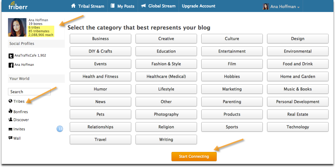 Once you create your free Triberr account, find the “Tribes” tab in the left sidebar.