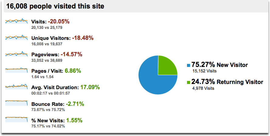 My best guess is that blog re-design kept me away from writing as much content and engaging on social networks and with other blogs as much as I normally would.