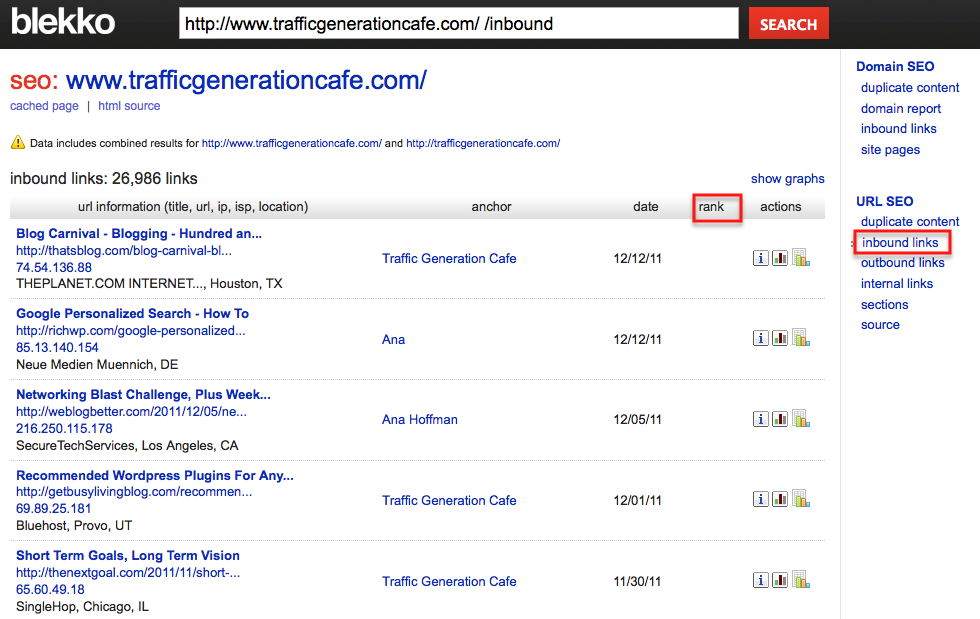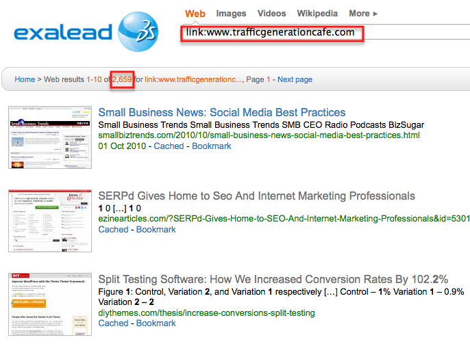 Here's a screenshot of Traffic Generation Cafe backlinks according to Blekko: