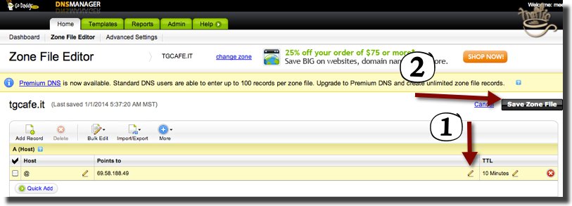 - Next, you’ll see Zone File Editor. Hover over the A (Host) record and you’ll see the little pencil pop up as shown under (1). Clicking on it will allow you to edit the record. Change the IP address (under Points to) to Bitly’s 69.58.188.49 - and don’t forget to Save Zone File (2).
